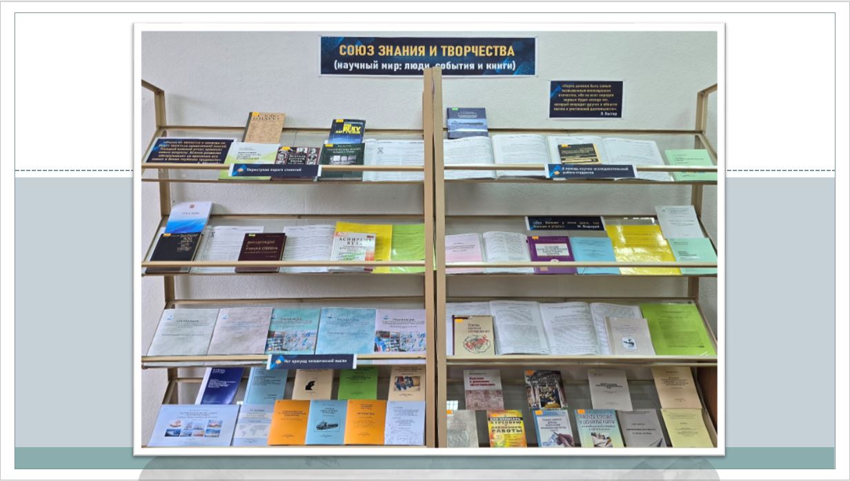 Интеграция науки и образования в живом учебном процессе способствует повышению качества подготовки кадров. На книжной выставке «Союз знания и творчества (научный мир: люди, события, книги)» представлена литература по истории, развитию и современным проблемам науки. Экспонируется она на научном абонементе научно-технической технической библиотеки БГАРФ.