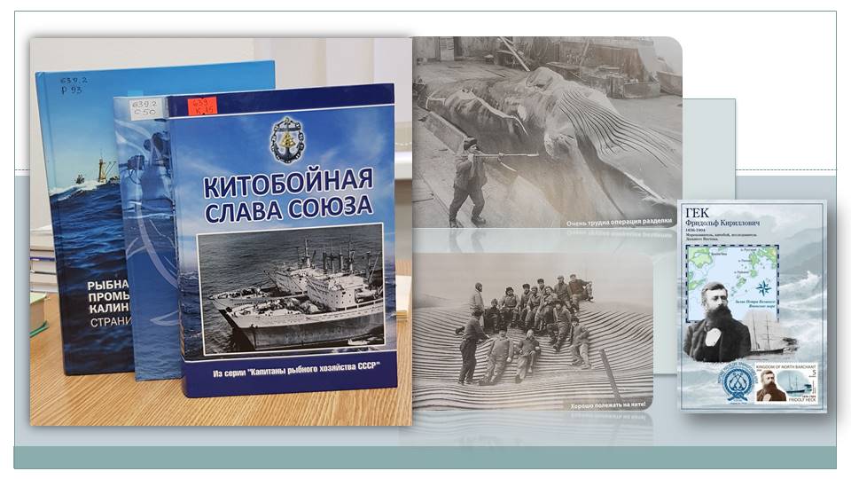 В книге Юрия Михайловича Смирнова «Китобойцы», которая есть в библиотеке академии, запечатлена история отечественного китобойного промысла во временном интервале 15 лет в период Советского Союза. Эти годы пришлись на трудное послевоенное время. В это время мировой китобойный промысел активно развивался. В 1946 году принимается Международная конвенция по регуляции китобойного промысла, и международная комиссия производит квотирование промысла китов.
