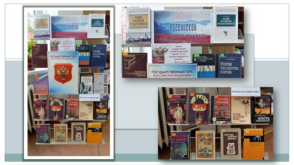 В читальном зале библиотеки академии в рамках книжной выставки «Основы российской государственности» представлены издания из фондов НТБ БГАРФ, раскрывающие содержание разделов образовательной дисциплины «Основы российской государственности»: «Что такое Россия», «Российское государство-цивилизация», «Российское мировоззрение и ценности российской цивилизации», «Политико-правовое устройство России», «Вызовы будущего и развитие страны».