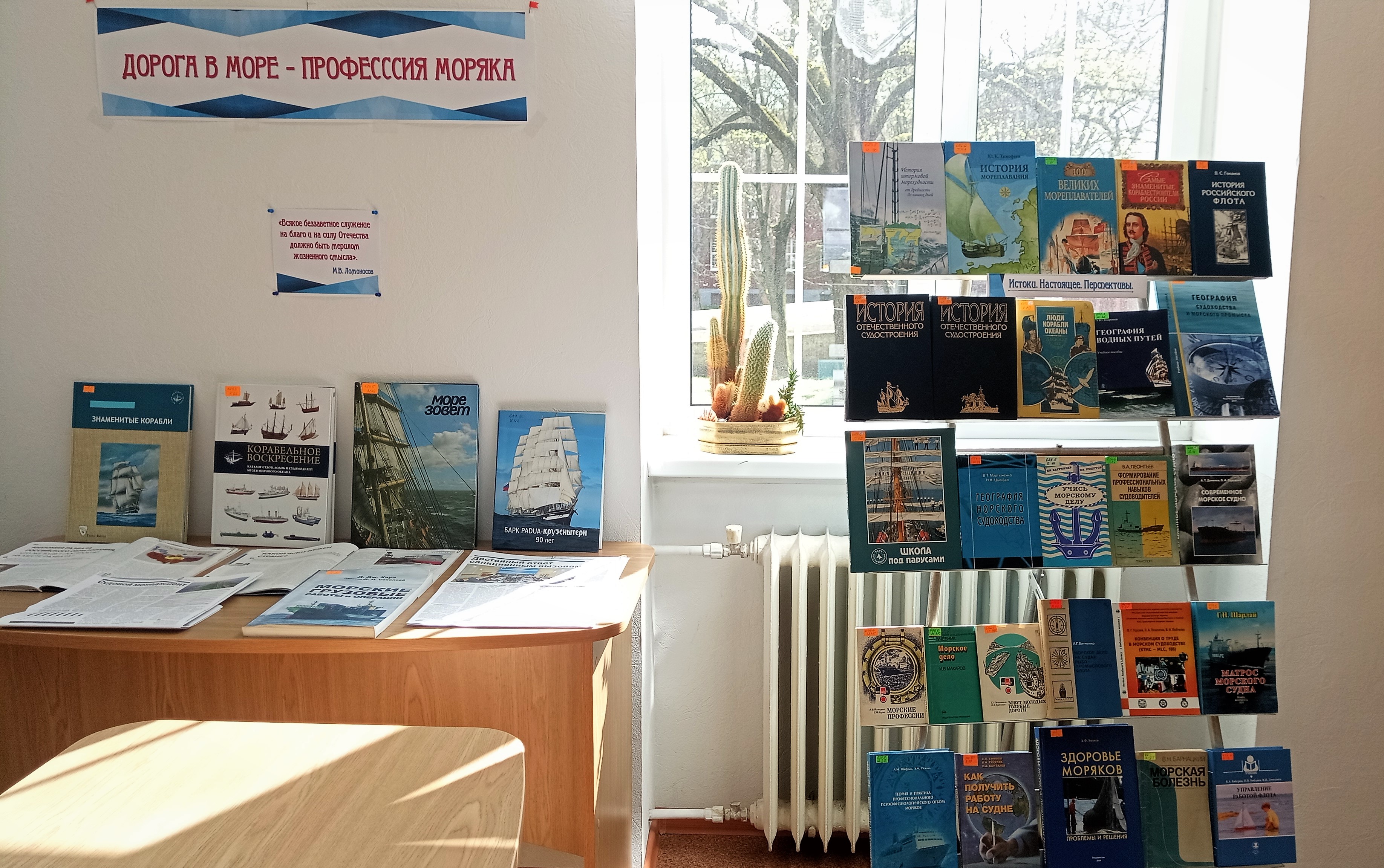 У входа в библиотеку оформлен стенд "Женщины в мужской профессии" с фотографиями наших преподавателей и персонала учебных барков «Крузенштерн» и «Седов». Также читальный зал приглашает посетить выставку книг и периодических изданий, посвященную женщинам в гражданском морском и речном флоте.