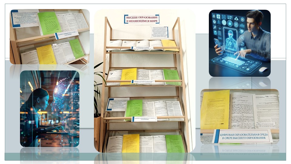 На выставке «Высшее образование в меняющемся мире» на научном абонементе НТБ БГАРФ представлены научные статьи по проблемам развития высшего образования в современной России. Эти публикации освещают текущие тенденции развития и реформирования высшего образования, проблемы управления качеством образования, инновационные процессы и новые информационные технологии в сфере образования.